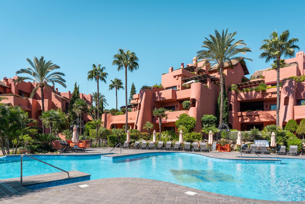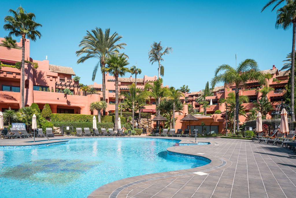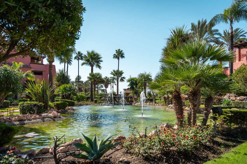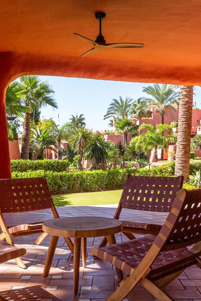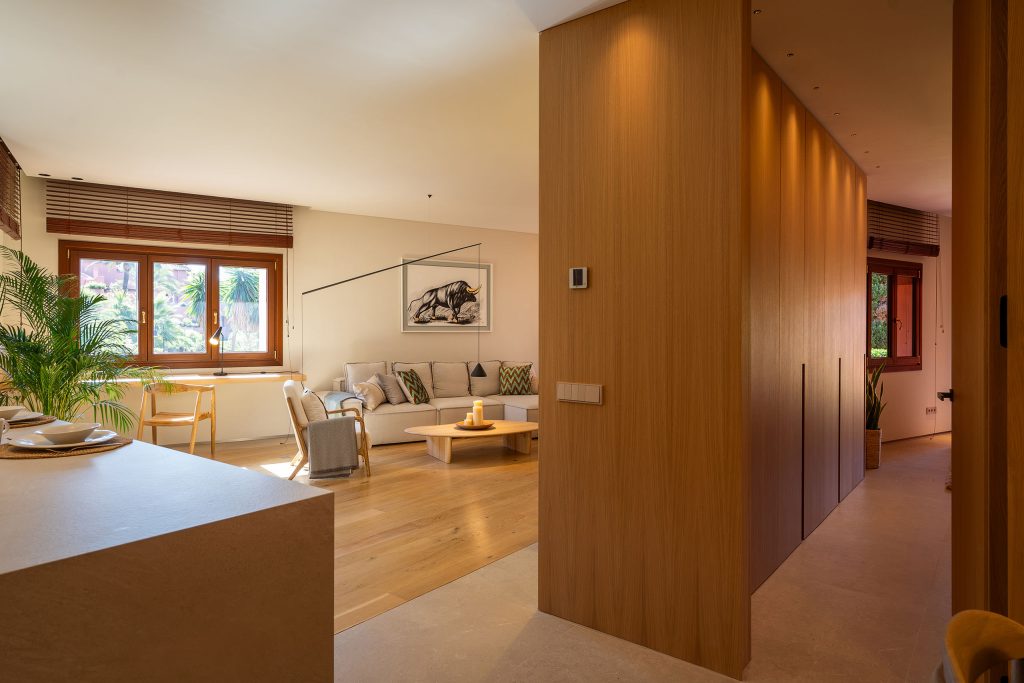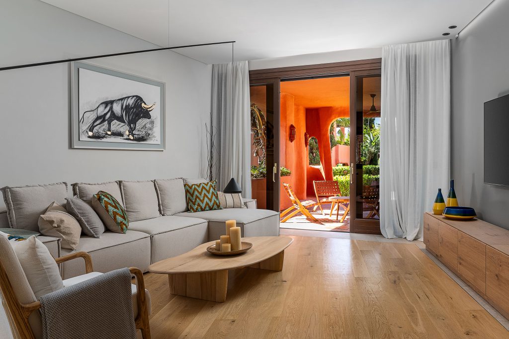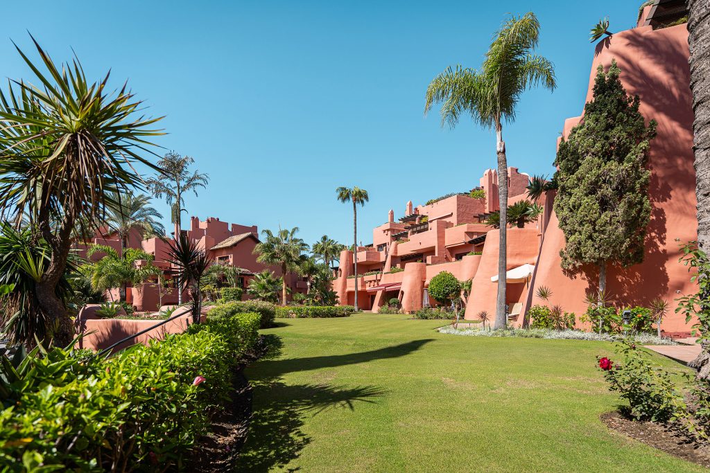 Este piso de tres habitaciones y tres baños está en Torre Bermeja, una de las urbanizaciones más exclusivas de Estepona. Está en planta baja, así que desde la terraza se sale directamente al jardín privado, y desde ahí, a las piscinas comunitarias, que son espectaculares. Es un sitio que transmite tranquilidad y lujo a partes iguales.